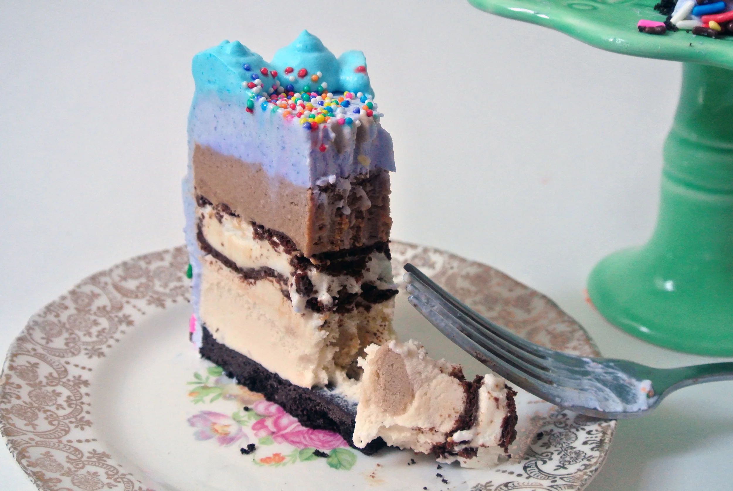 Cake was out of the question. With everything Chelsea and I have in common, from our affinity for Disney to our love of late night comedy, there are a couple things we disagree on. Chelsea doesn't like cake. (You are crazy Chelsea) I had to get more creative. Personally, I don't think you've got a birthday dessert unless cake is involved so I decided a cake-shaped ice cream dessert would have to do! This is one cake you don't need an oven or batter for. With no baking, the assembly is the only thing that will take you a bit of time. That and deciding your favorite flavors of ice cream to layer up.
