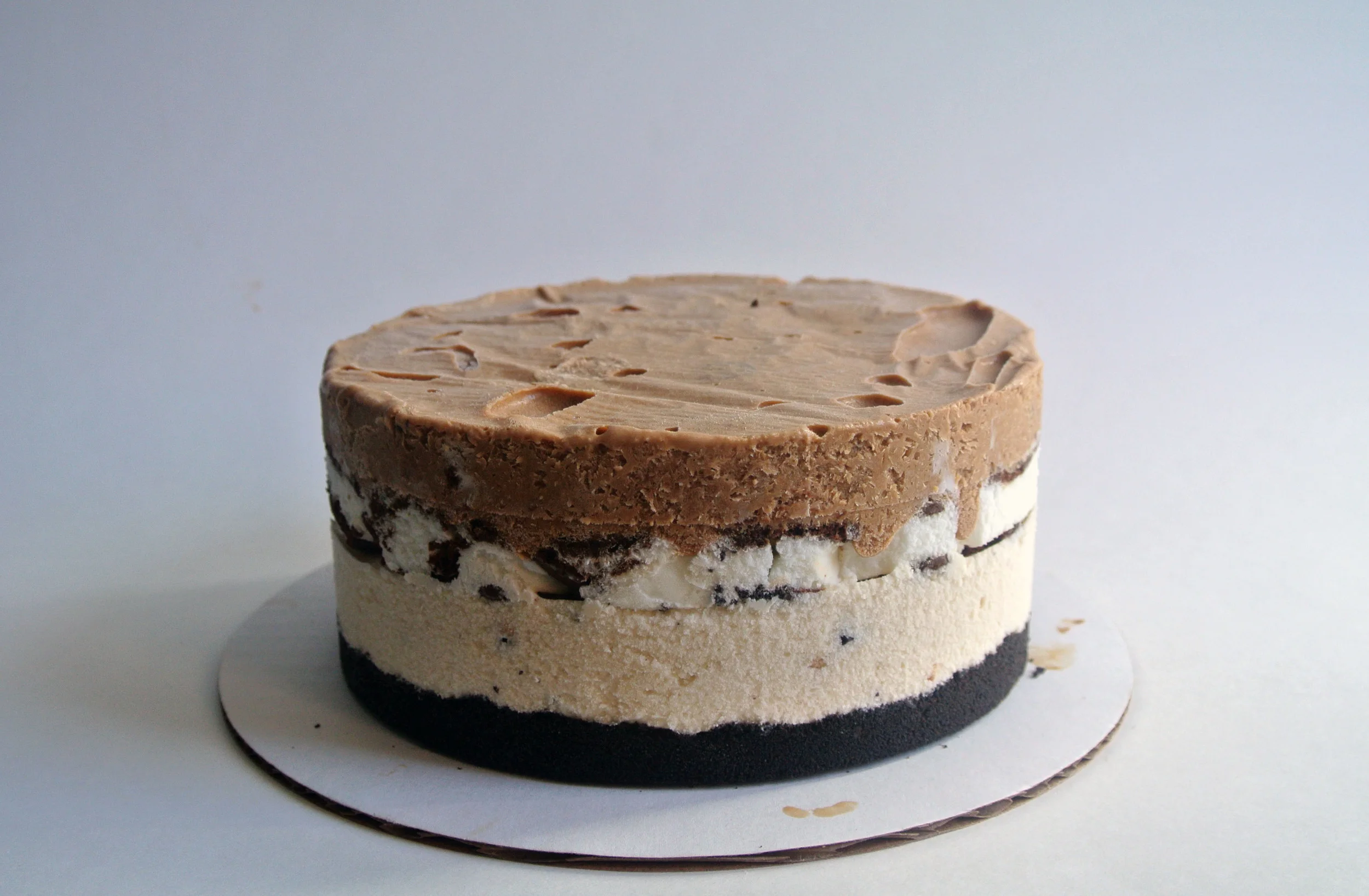 In a food processor, grind Oreo cookies into a fine powder. Add in melted butter and pulse until crumbs are wet. Press buttery cookie mixture into the bottom of the springform pan. Place springform pan into freezer to set for twenty minutes. Remove cookie dough ice cream from freezer to softer for ten minutes while the Oreo crust chills. Empty the pint on top of the Oreo crust and use the back of the spoon to evenly spread the ice cream into a smooth layer. Put the pan back in the freezer for a minimum of two hours. Next, layer the mini ice cream sandwiches on top of the cookie dough ice cream layer. Cut bars to ensure the sandwiches go all the way around the sides. I cut the bars into small pieces to make sure the layer looked even. Return the cake to the freezer to freeze another two hours. Ten minutes before beginning the next layer, take the salted caramel ice cream out of the freezer. Again, empty the pint on top of the previous layer and use the back of a spoon to spread it evenly. Cover the pan with plastic wrap and place in the freezer for four hours or overnight.
