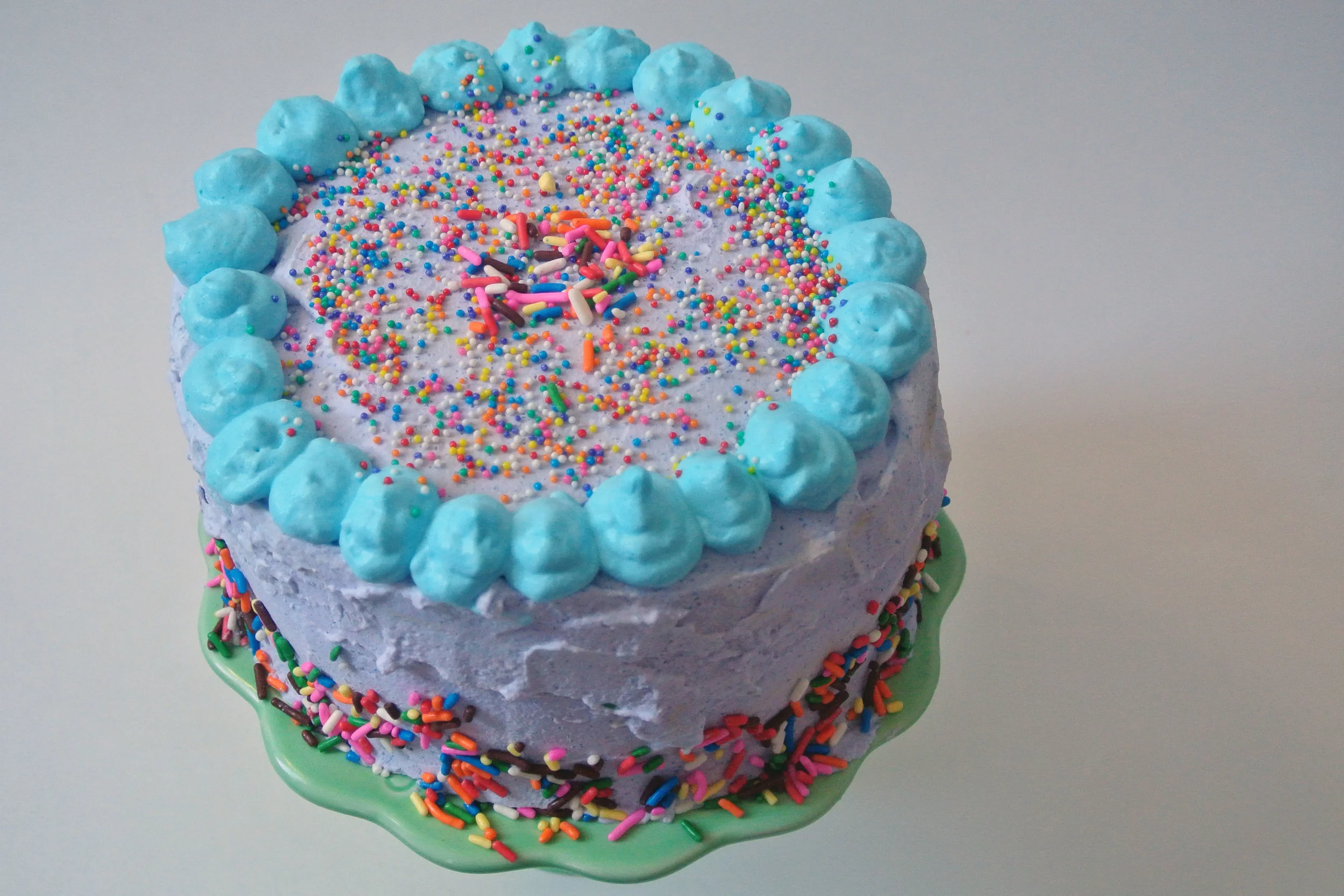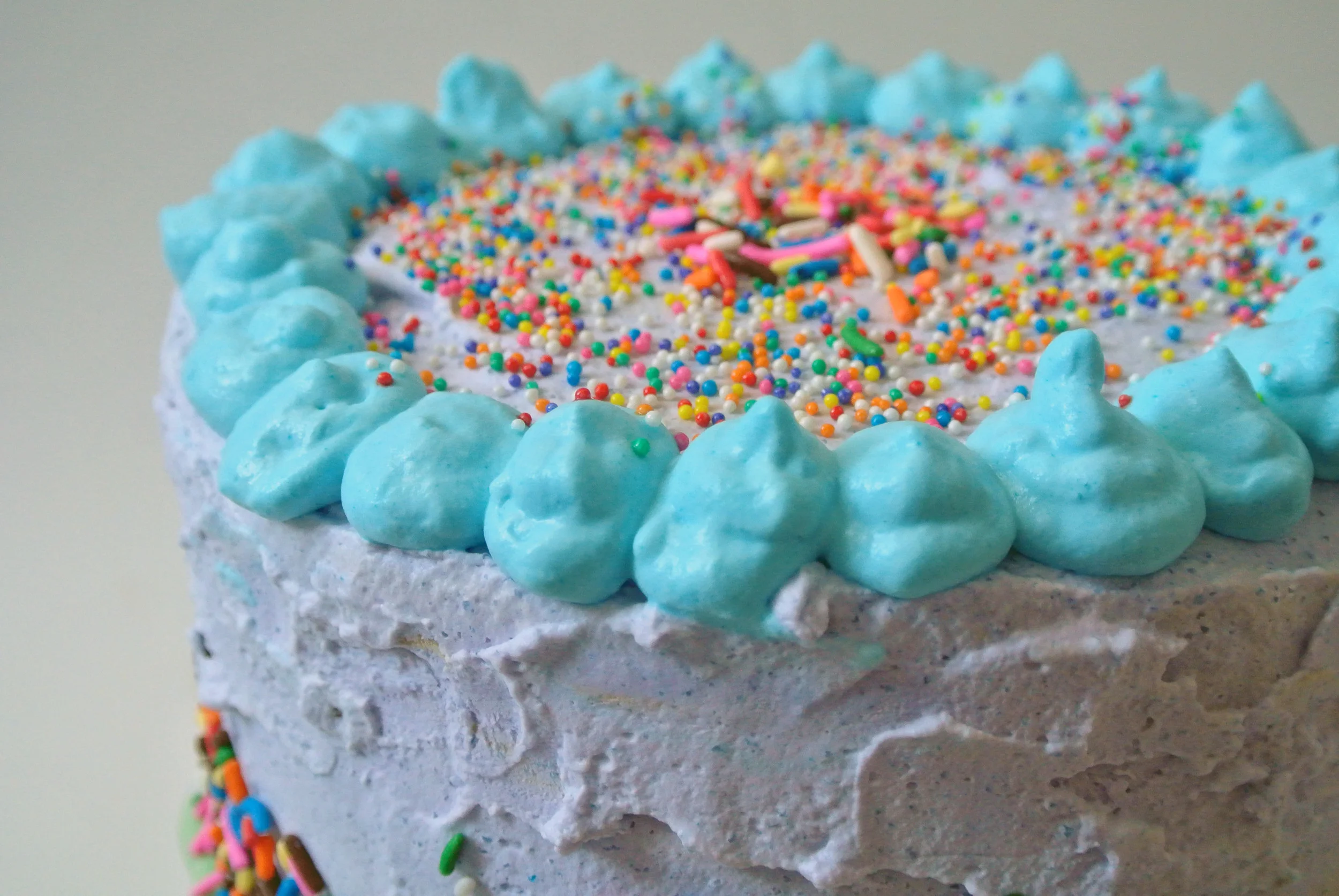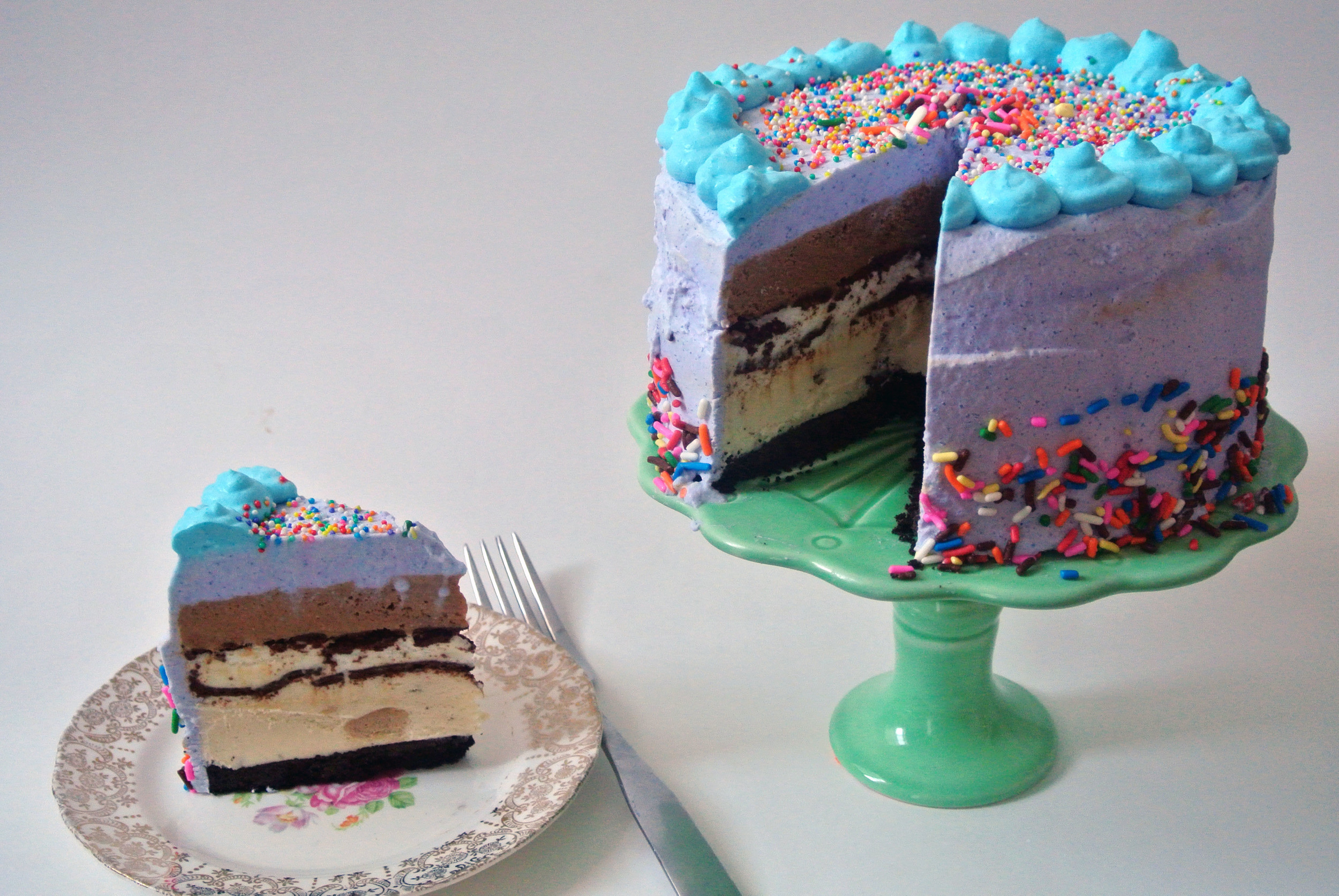 Make whipped cream frosting prior to removing the cake from your springform pan. Separate 1 1/2 cups of the frosting and tint it blue with 2 drops sky blue food coloring gel. Set aside in a star-tipped pastry bag and leave in the refrigerator until ready to use. Create violet frosting with remainder of the frosting with 5 drops blue food coloring gel and 2 drops of red food coloring gel. Be careful not to over whip. Remove the cake from the springform pan and spread the violet frosting over the frozen cake with a frosting spatula (or butter knife). Don't worry about it being perfect, the goal is to get it covered before the ice cream starts to melt. Return the frosting covered cake to the freezer for thirty minutes. Remove from freezer and gently press sprinkles onto the bottom inch of the cake as well as the top. Take blue whipped cream frosting and pipe small "bursts" onto the top of the cake. Serve immediately or store in the freezer up to one week.