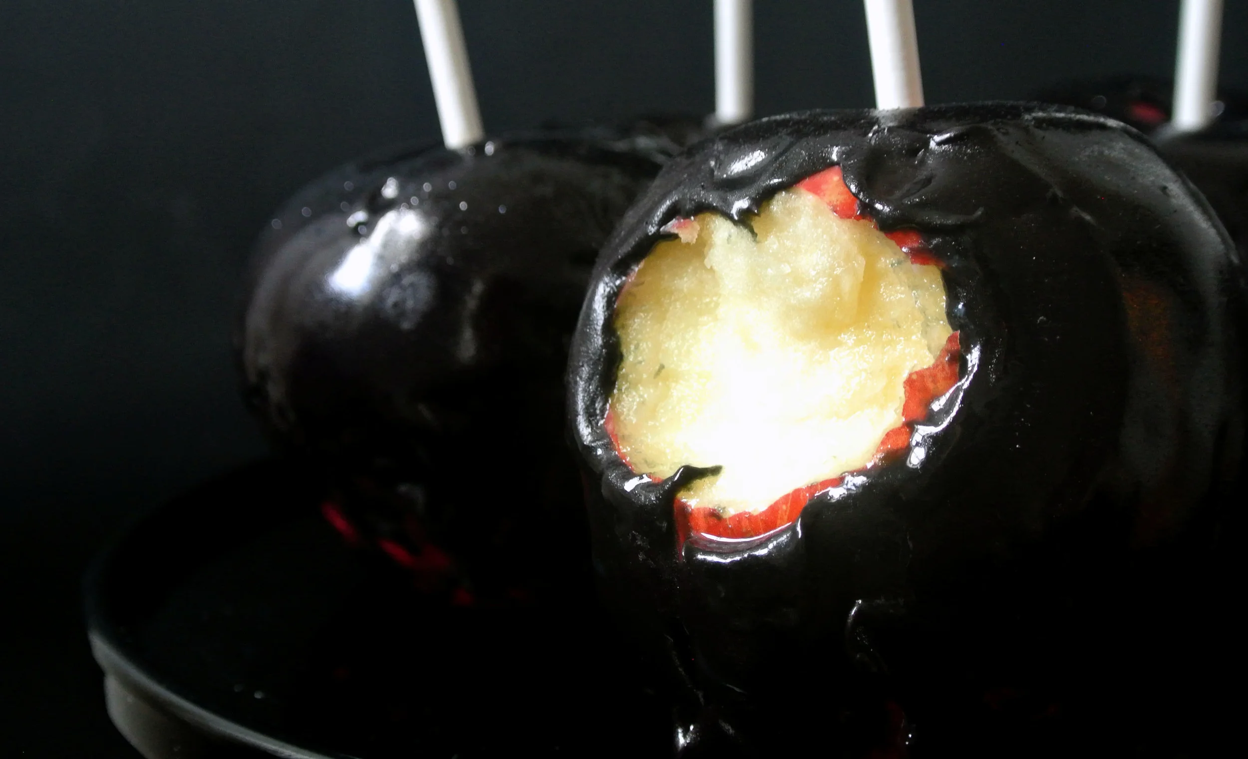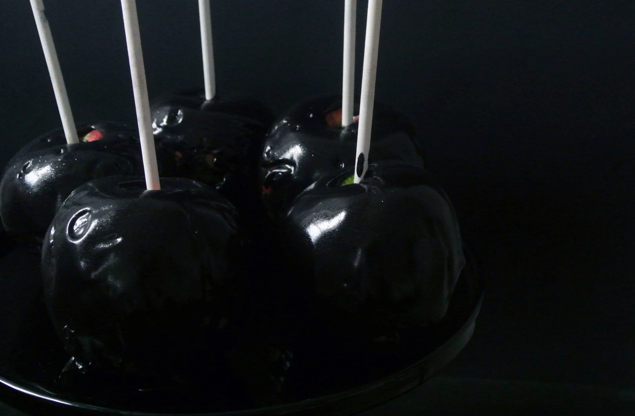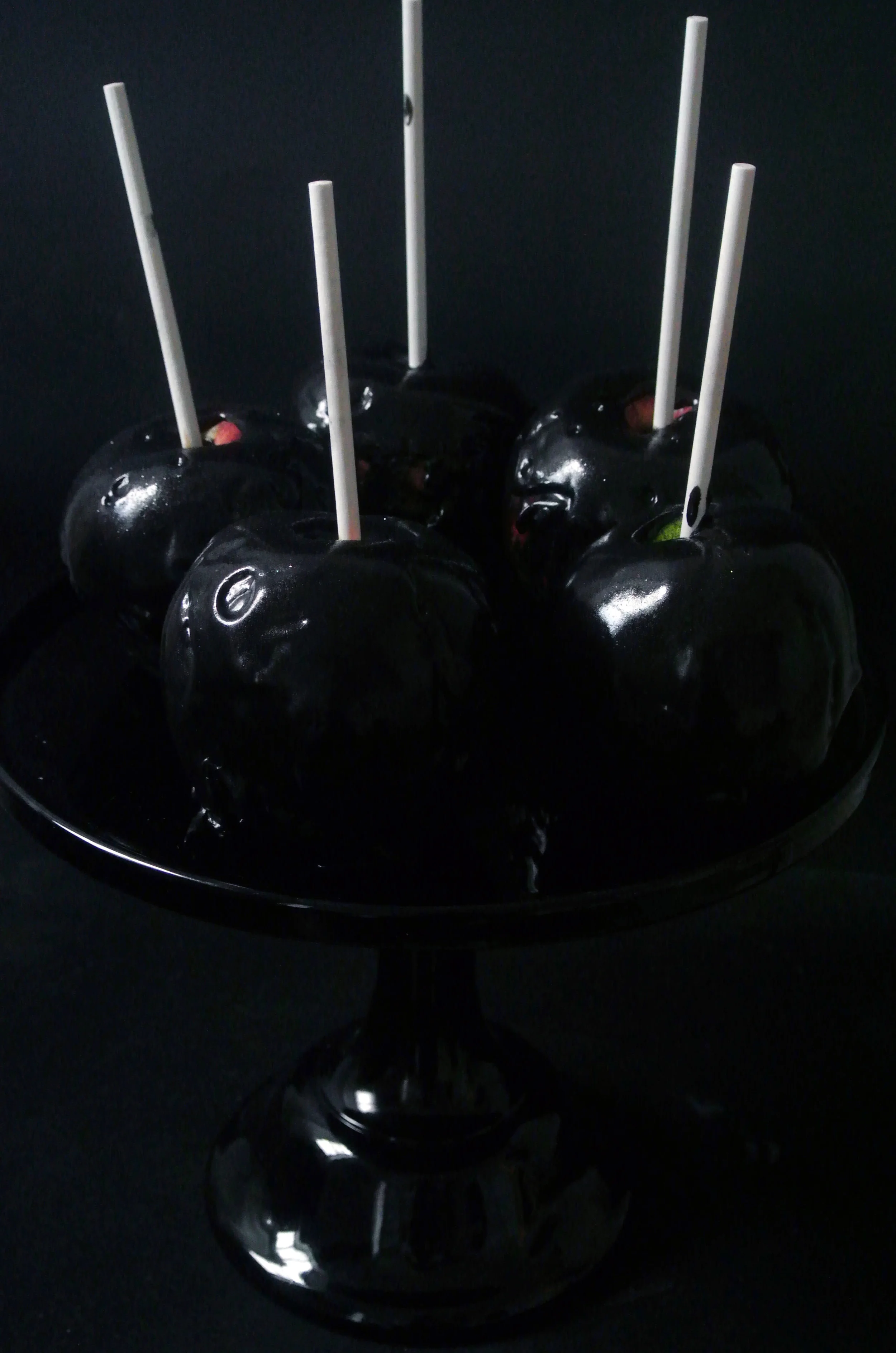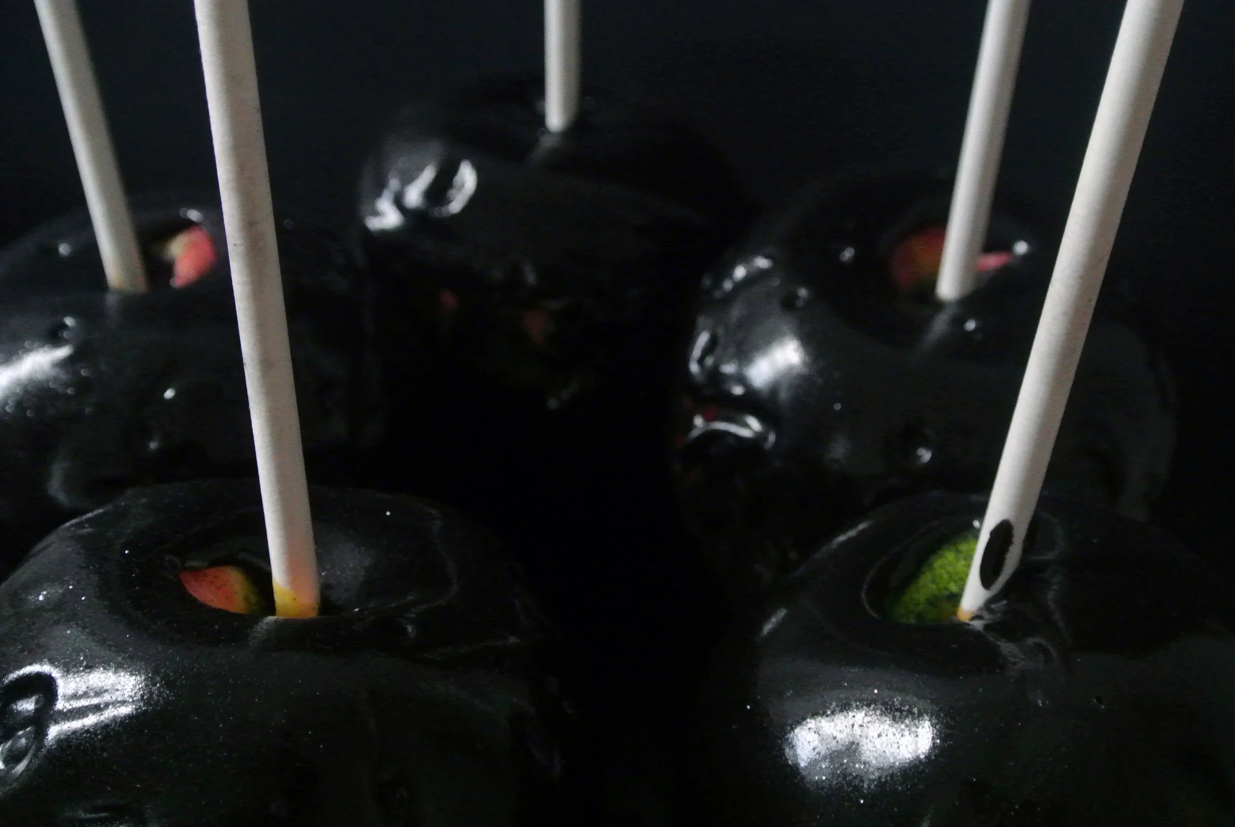 Next, spear your apple cores with a cookie stick. I used a hammer to make sure mine were firmly secured. What can I say? I have violent tendencies. Holding onto the stick, dunk your apples into the black caramel until fully submerged lift out of the caramel and hold above the pot for sixty seconds or so to prevent severe pooling of caramel around the apples while they dry. Save any extra caramel for a spooky ice cream topper.
