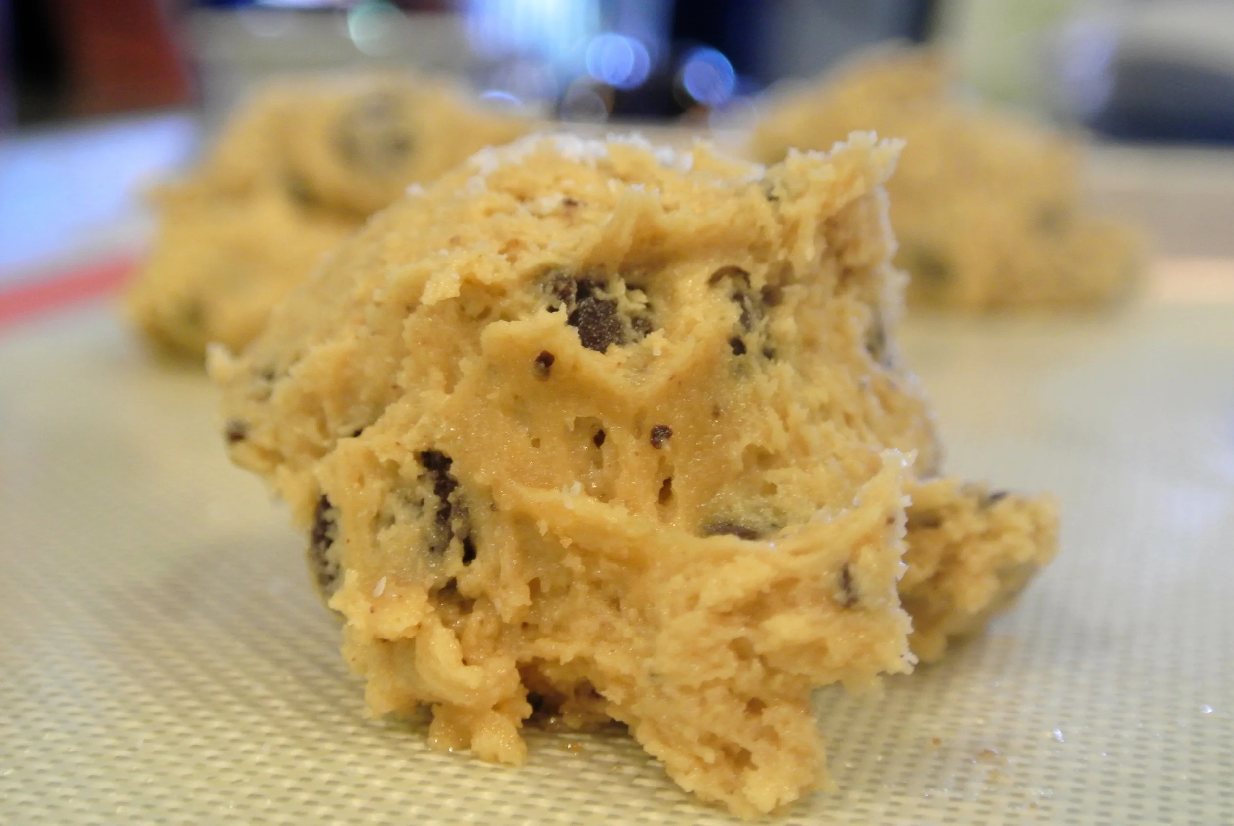 Finally add in chocolate on lowest mix setting. Use an ice cream scoop to place cookie dough onto Silpat-lined baking sheets. Make sure to leave plenty of room for the cookies to spread out because they will almost triple in diameter. I put about six cookies per ½ size baking sheet. Sprinkle with kosher salt if desired.