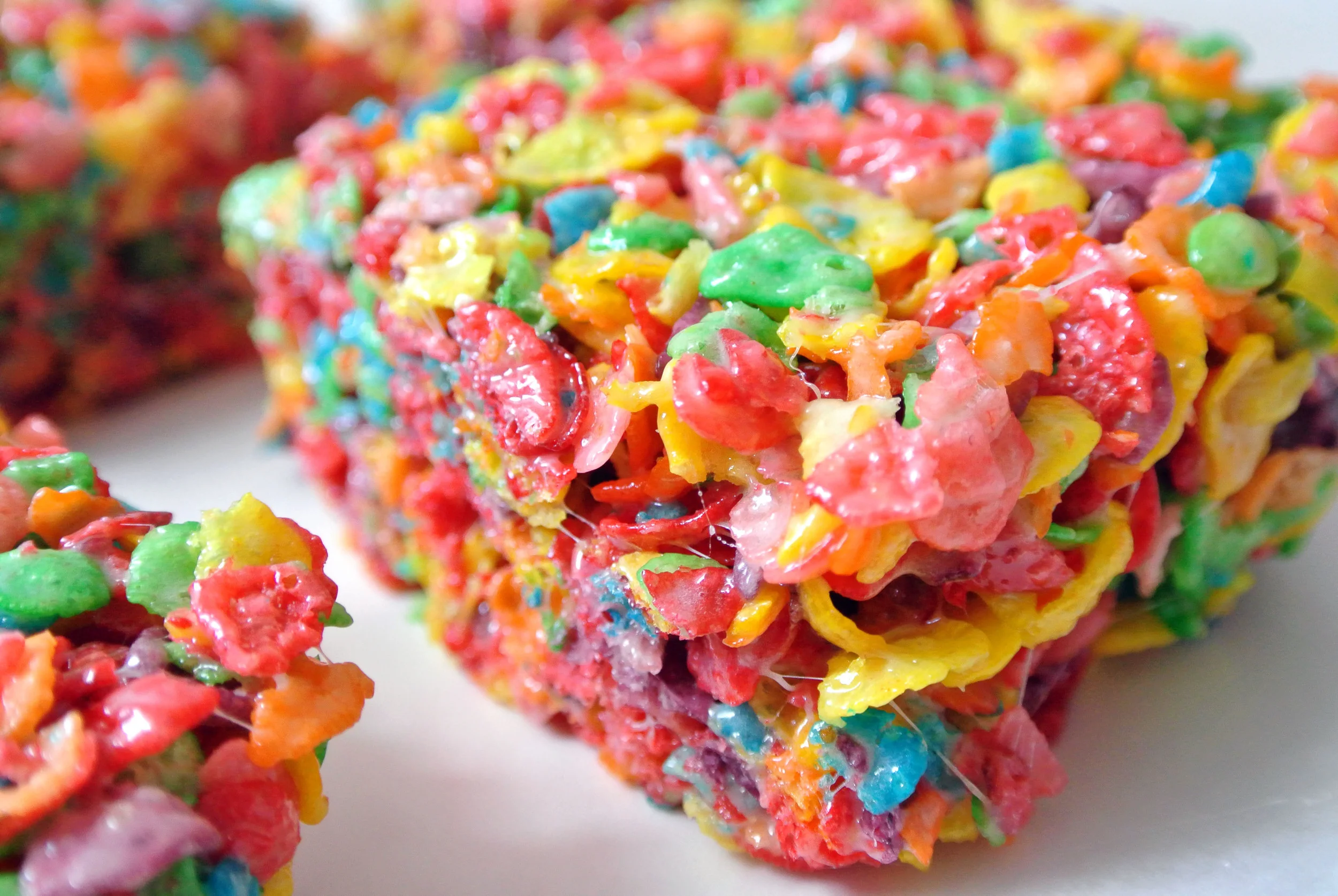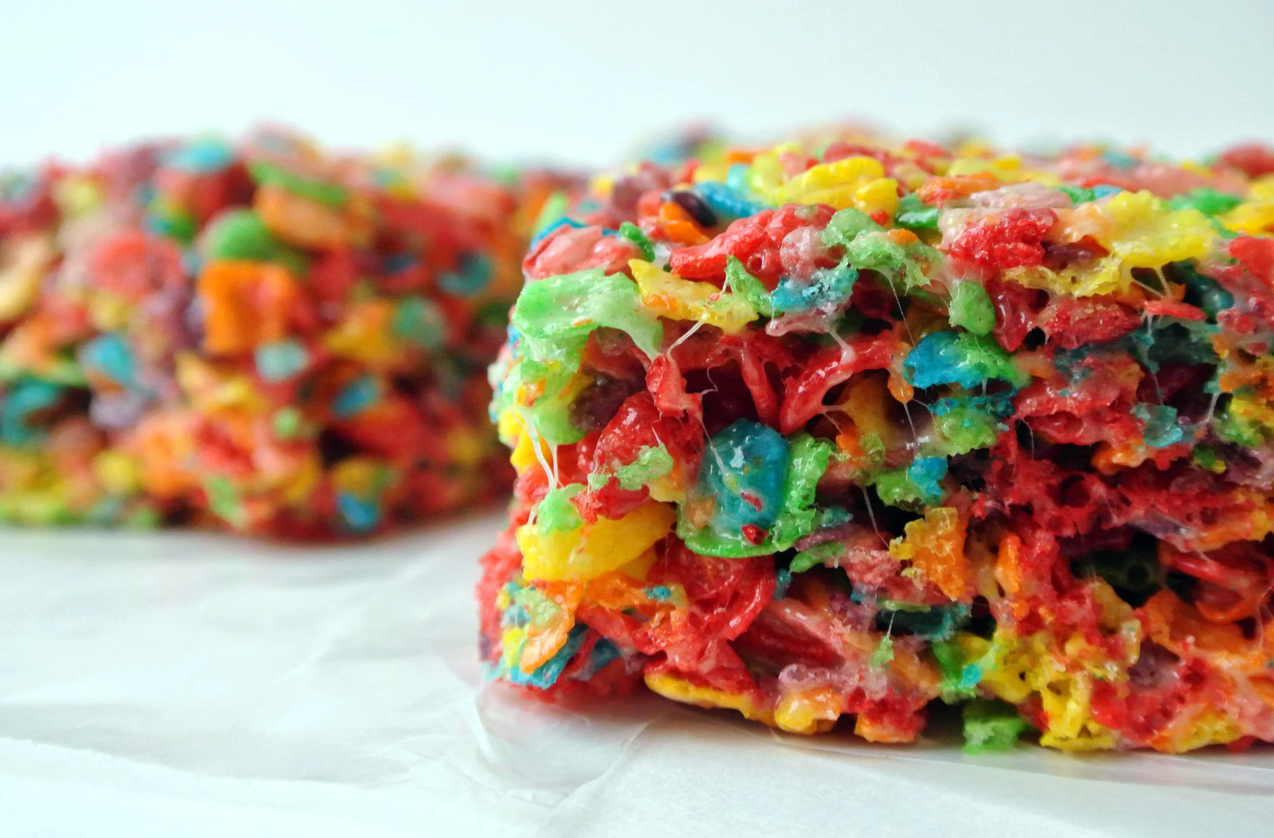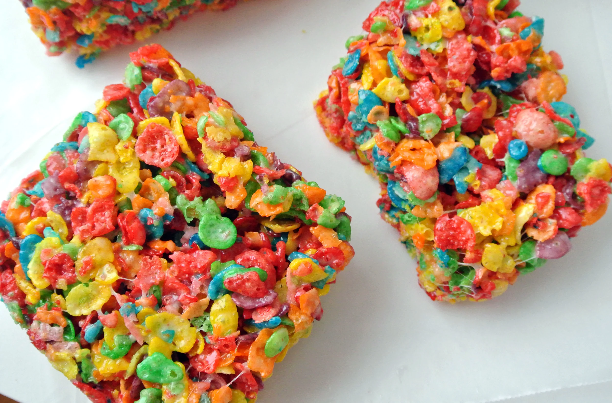 Growing up, Fruity Pebbles were a favorite of mine. Who am I kidding; they still are! Crunchy, colorful, and full of artificial flavoring they are hard not to love. When I saw a box on sale at Target over the weekend I picked up a giant family sized box. After scarfing down a giant bowl of fruity deliciousness Sunday morning I had a thought. Could I take the nostalgic flavor of Fruity Pebbles and put it into dessert form... quickly? Then it dawned on me. Why not substitute Rice Krispy cereal in a marshmallow treat?! I mean, butter and marshmallows are going to bind together any cereal but you can't deny the colorful appeal of Fruity Pebbles.