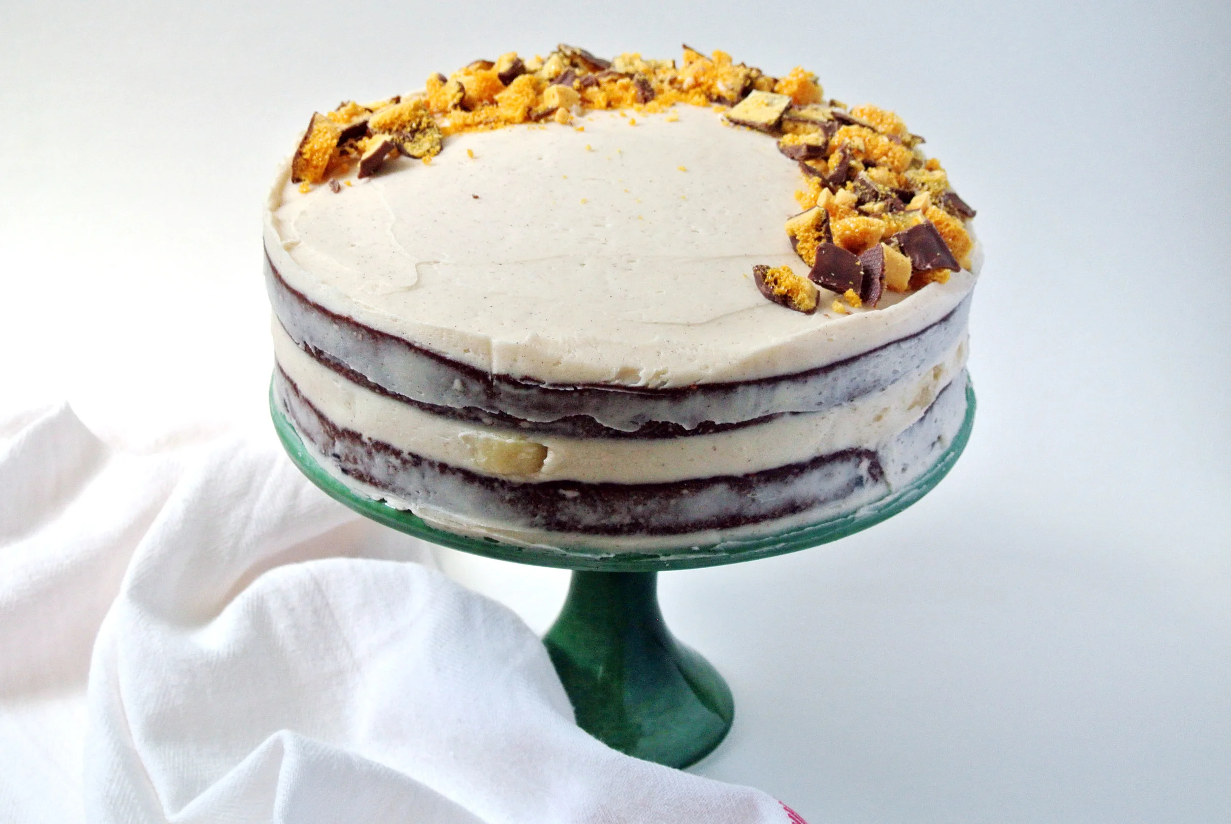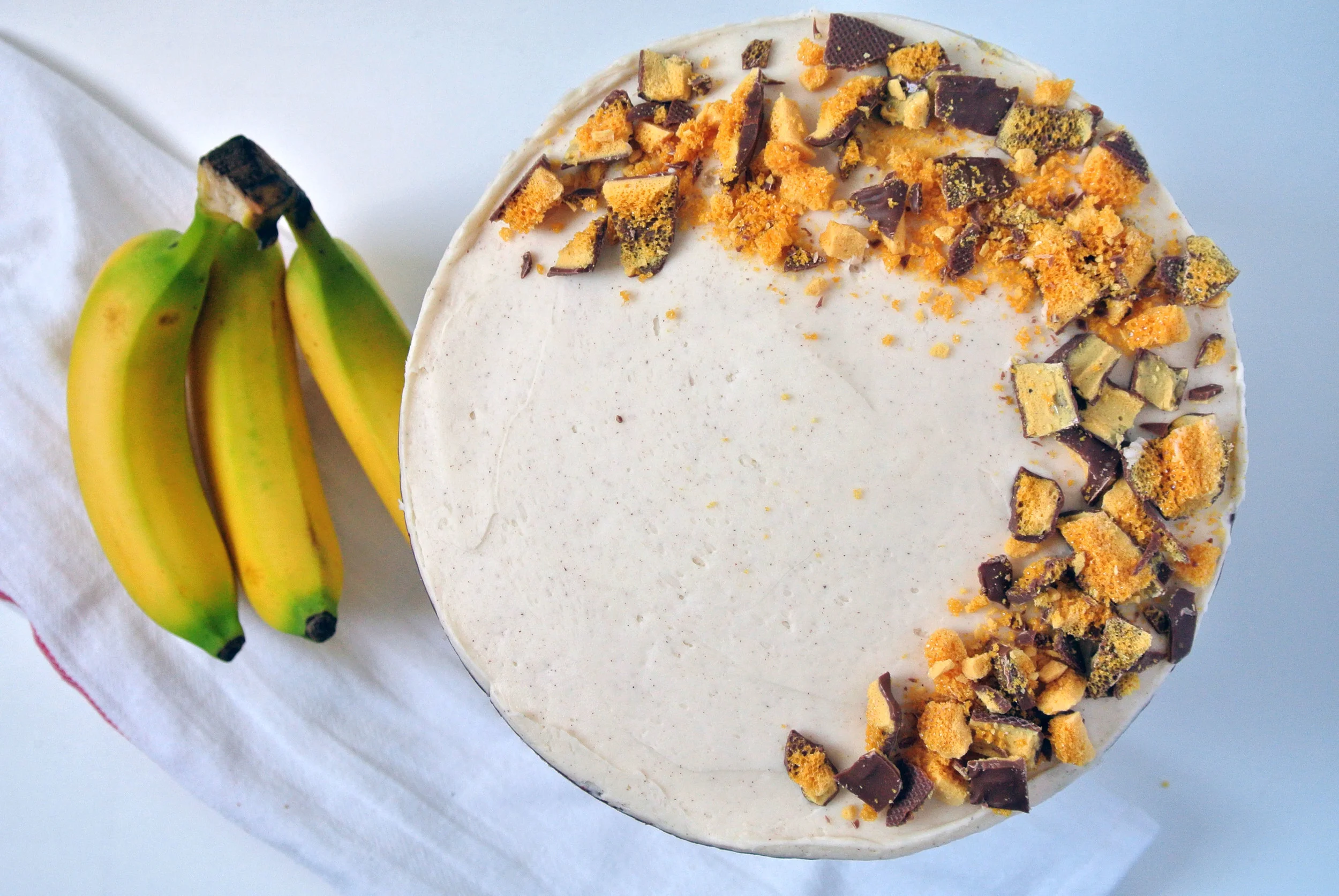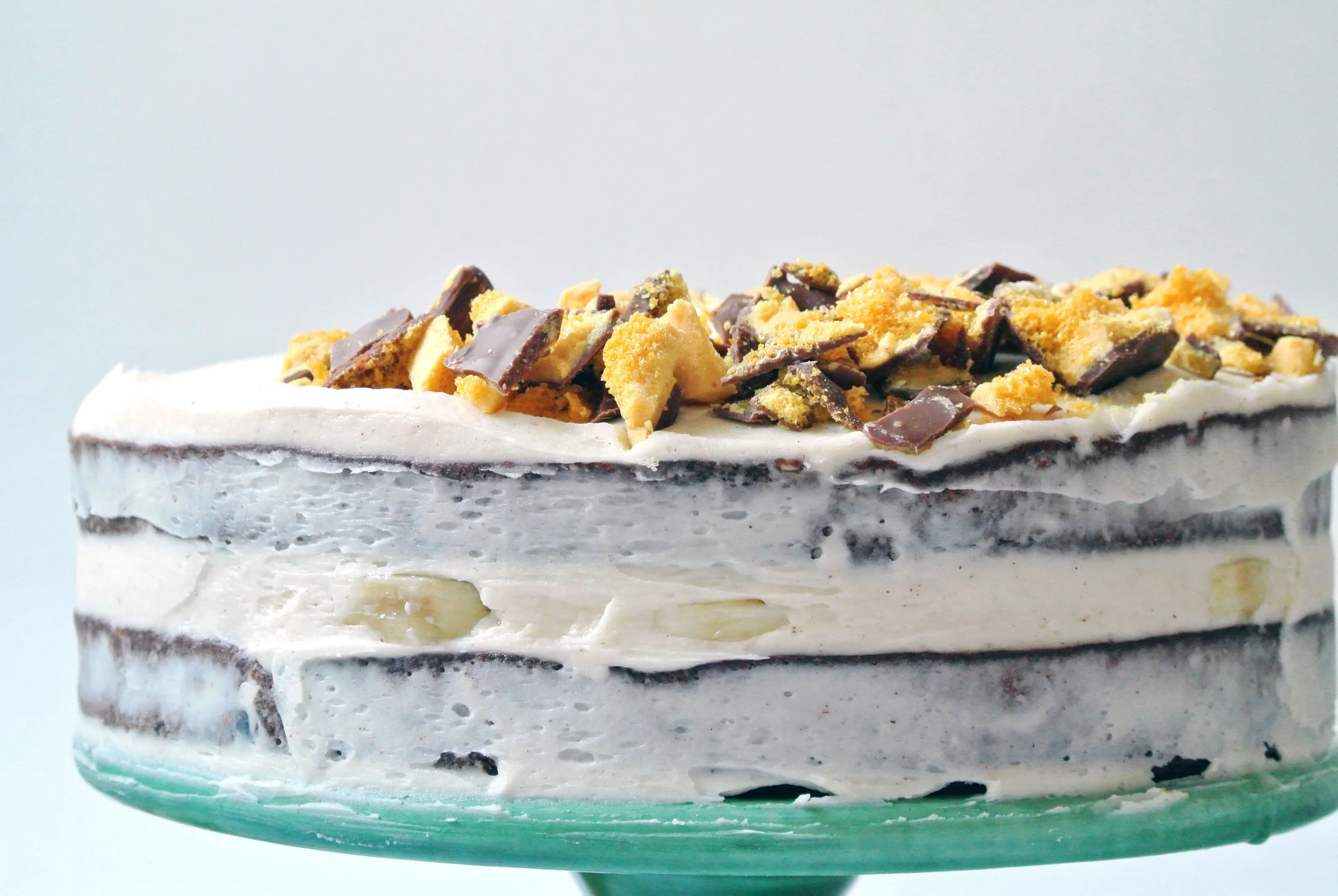 Fresh sliced bananas sandwiched between layers of dense, moist, and chocolatey banana cake with a cinnamon honey buttercream and crisp crushed chocolate covered honeycomb sprinkled on top. Phew; that's a mouthful. A mouthful of something I want to eat.