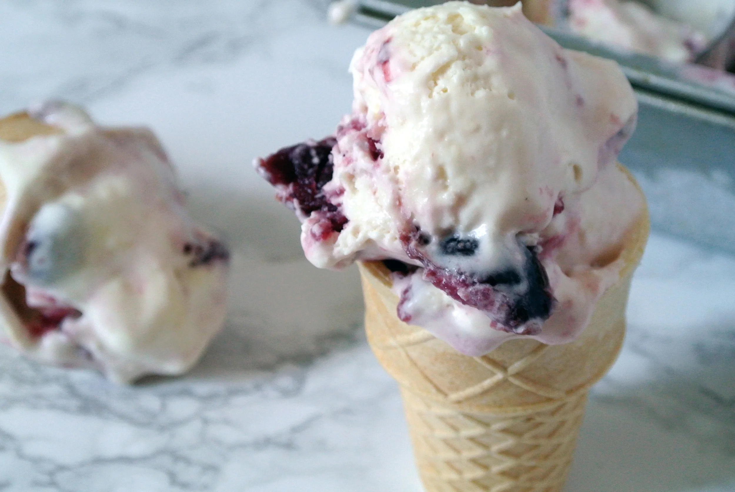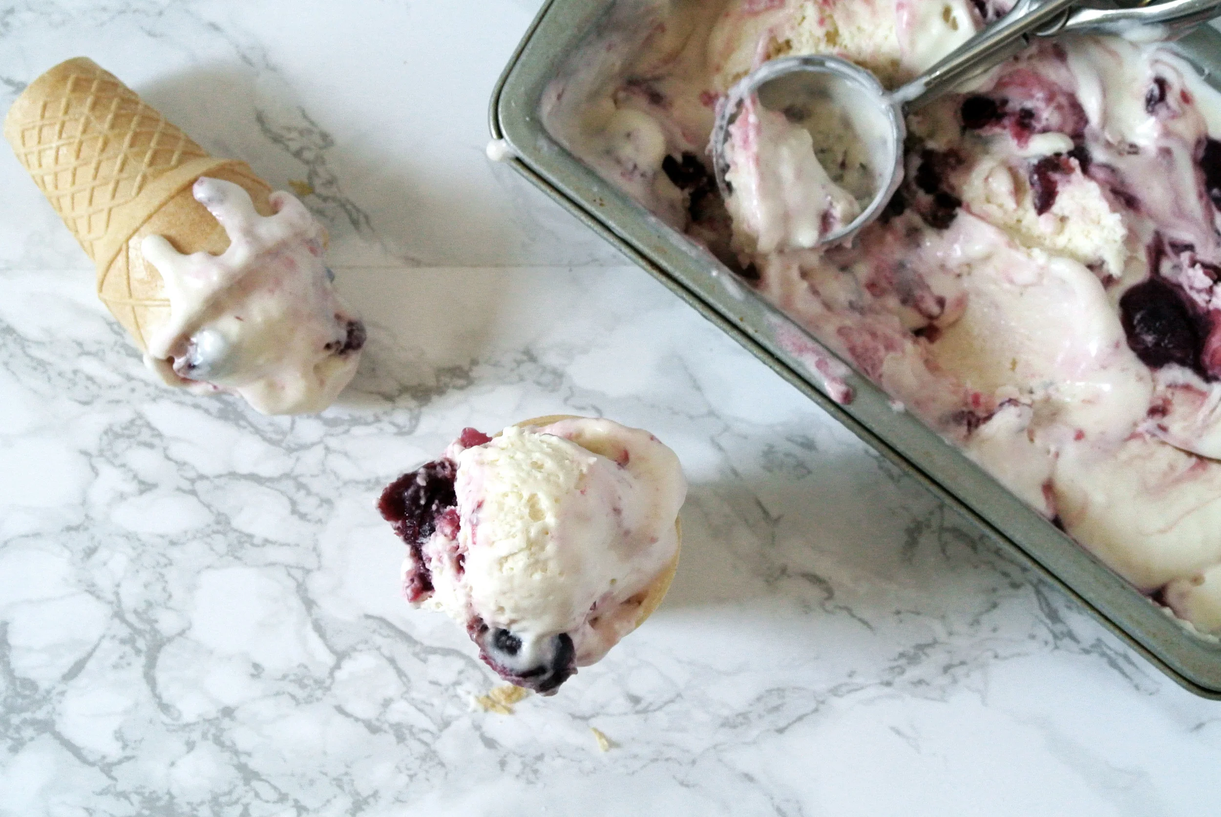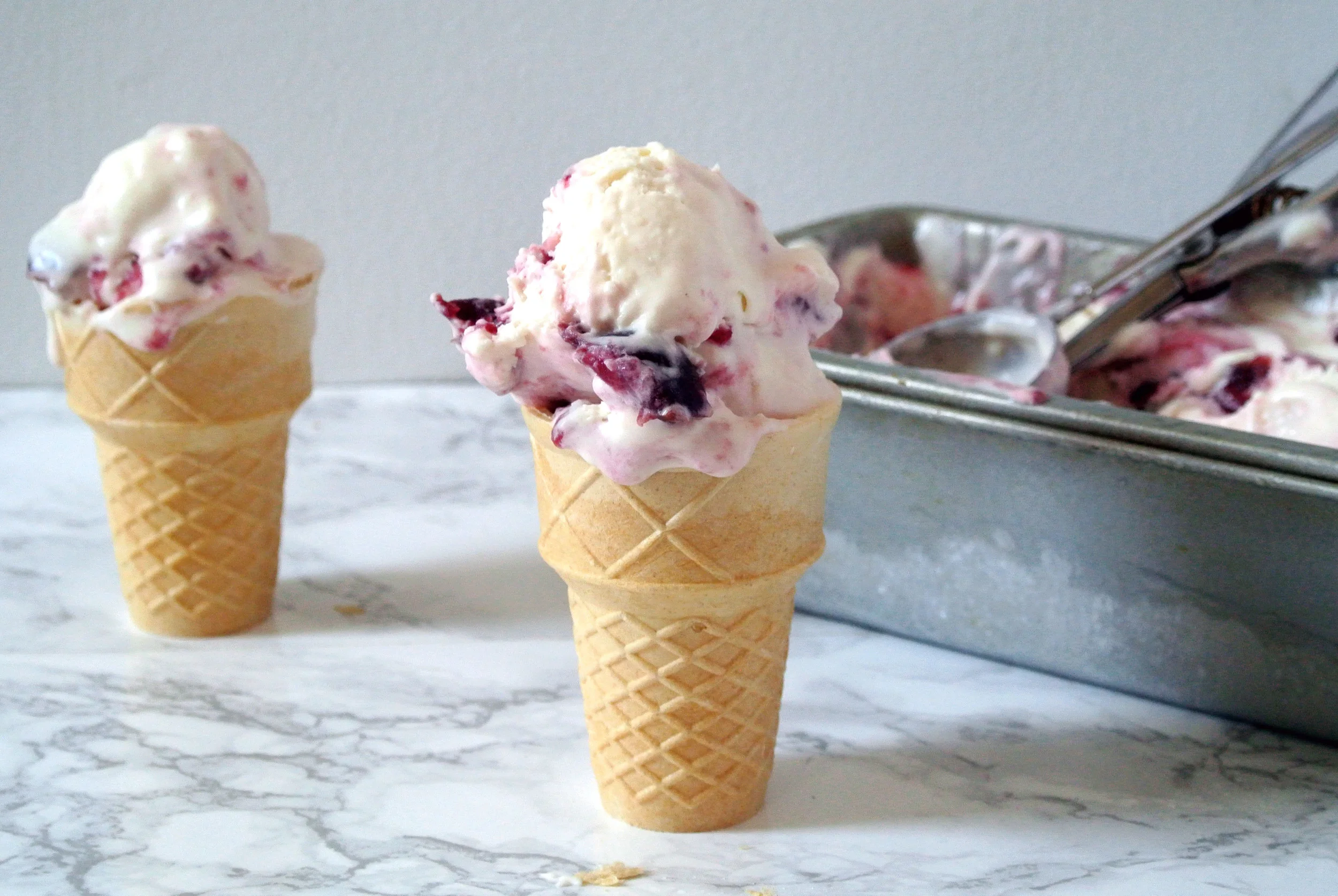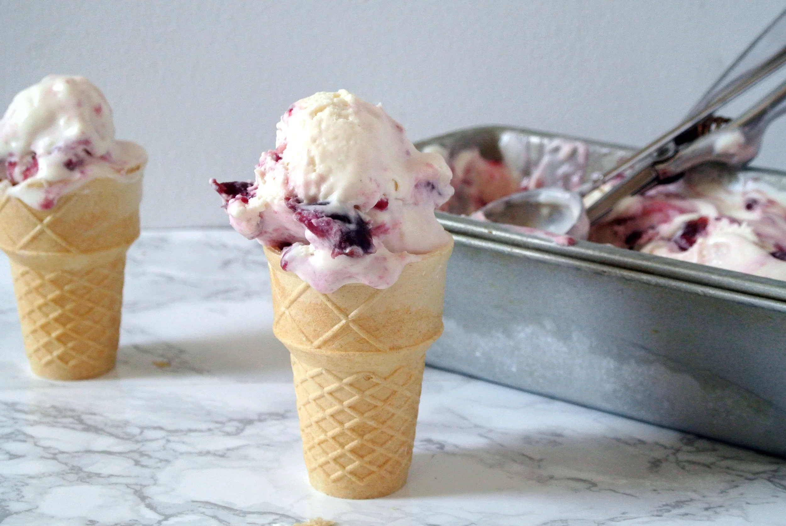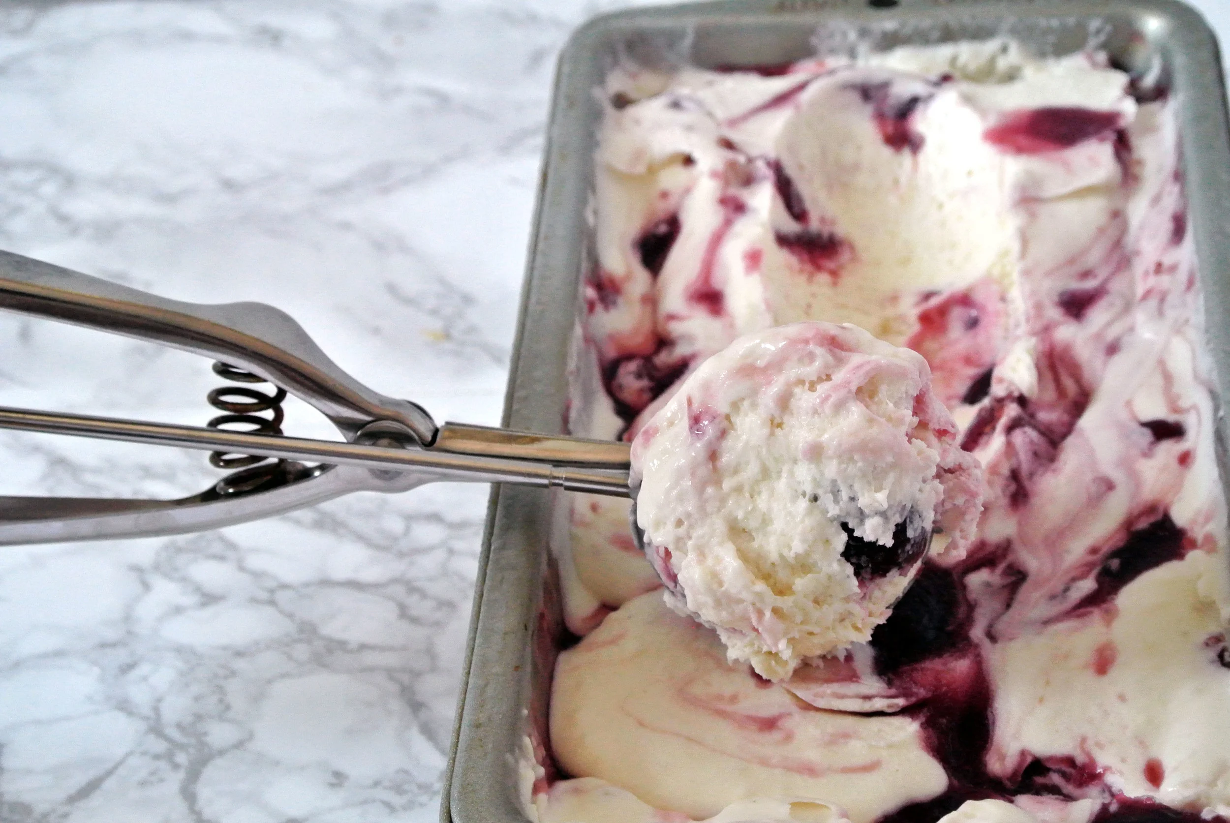 Once ice cream base is chilled, transfer to the bowl of your ice cream maker and churn for approximately thirty minutes or a smooth, icy consistency is reached. Quickly move the ice cream into an ice cream container (or loaf pan) and stir in spoonfuls of cherry compote. Cover and freeze immediately. Enjoy after four or more hours of freezing!