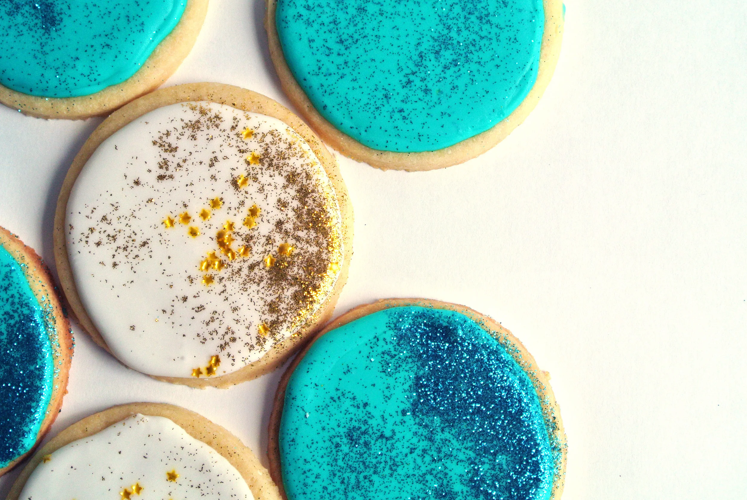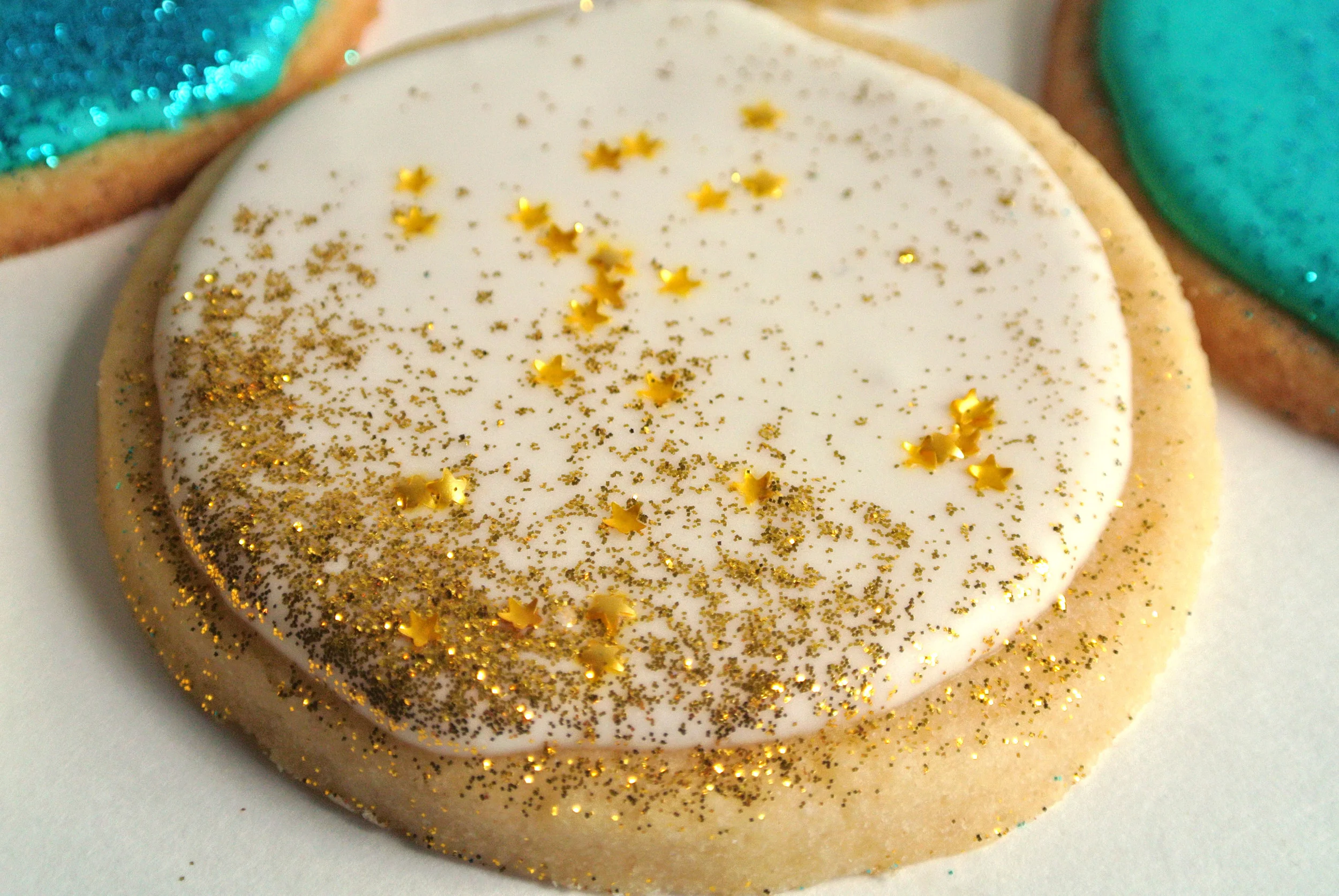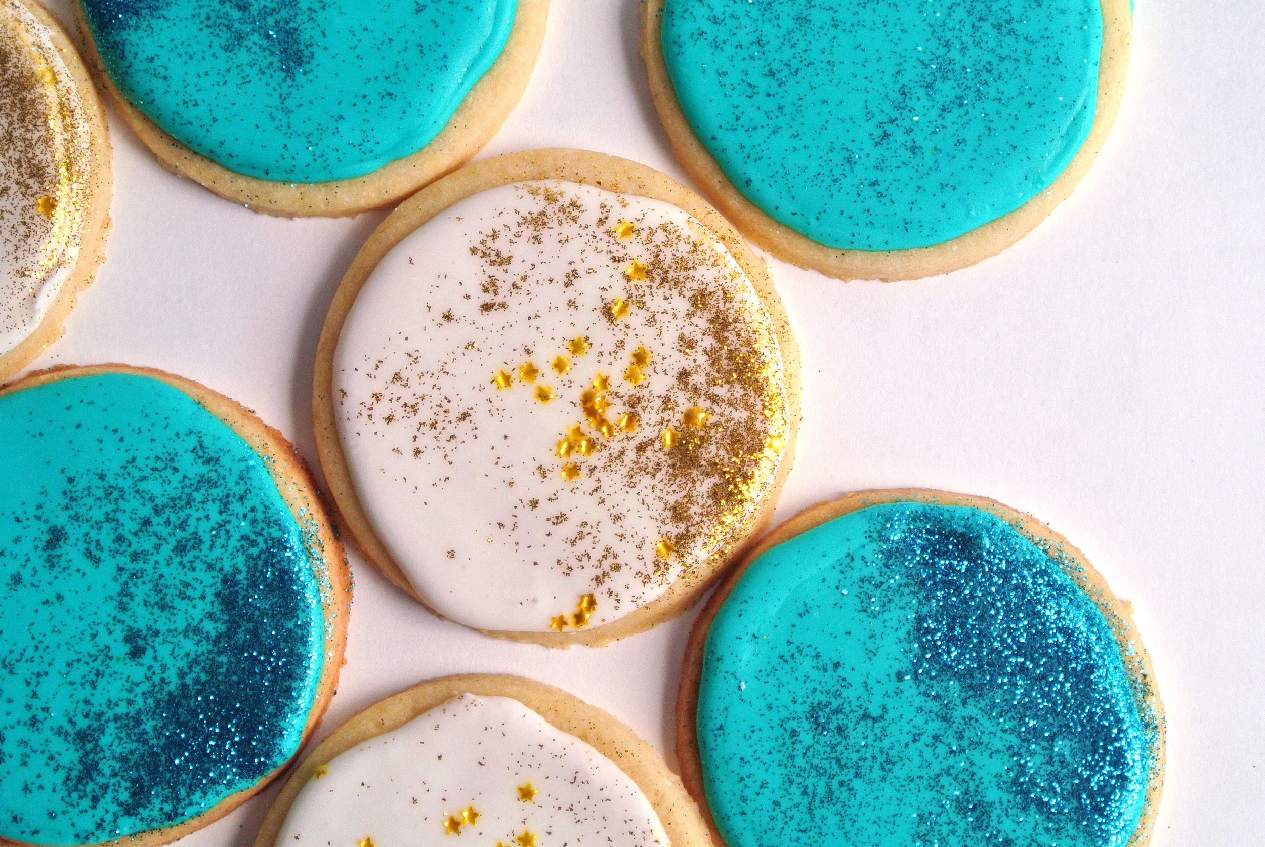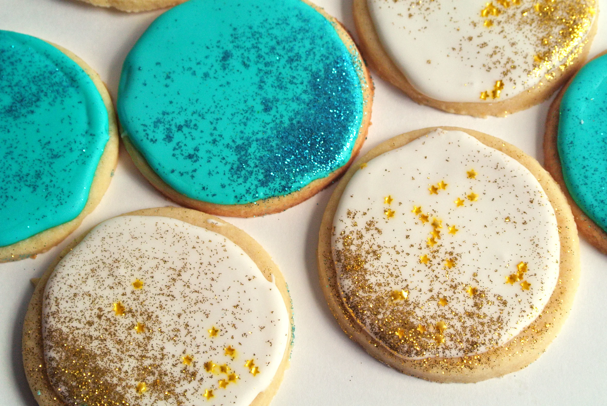 Pour your royal icing into two different pastry bags. The best way to do this is to take an un-cut bag and place it, tip side down in a pint glass and spread the opening out over the sides of the cup. Fill the pastry bag and close the top, twisting to release air. To fill a circular cookie, Cut a small sized hole off the tip of your pastry bag and keep your wrist steady as you "rim" the edge of the cookie. It's like creating a dam around the outside of your cookie so you can fill it in a couple min. Royal icing hardens after sitting out, exposed to air. After rimming a few cookies, squirt out a silver-dollar sized amount of icing into the middle of the cookie. Use a butter knife to gently spread the icing around. It tends to even itself out. Sprinkle with disco dust or sprinkles and, voila! Beautiful, glitter cookie complete!