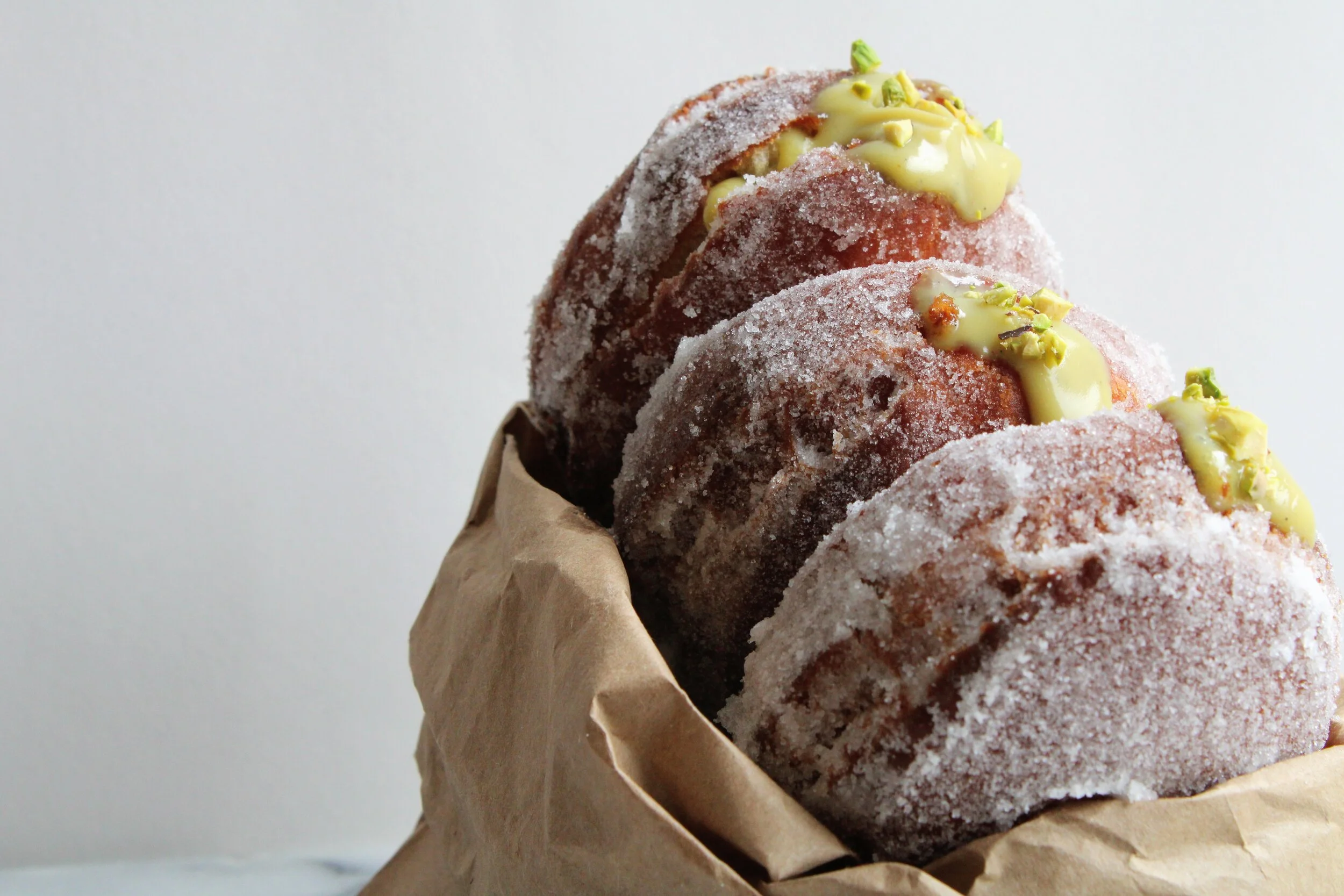 To provide a unique, and true-to-Italy twist, I whipped up a pistachio pastry cream to fill my baby bomboloni. Before departing from Florence in 2018, I brought home a small jar of pistachio paste. That pistachio paste barely made it a week in my refrigerator back home because I kept sneaking small bites out of the jar until it had all but disappeared. Luckily, you can order similar Italian varieties on Amazon, Eataly, or your local pastry supplier. Sweet pistachio and custard go together like peanut butter and jelly, which means this pastry cream is not only eye-catching, it’s downright delicious.